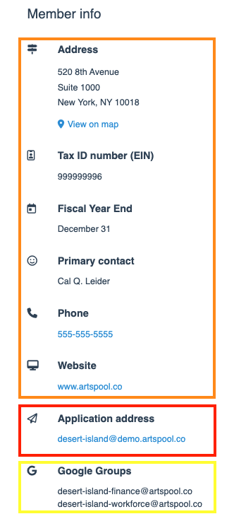 This section contains information useful to ArtsPool, like a member's address, tax ID number, fiscal year-end, primary contact, phone number, and website. It also contains a couple of special email addresses that we use in our work with you.