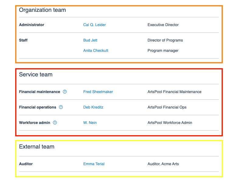 The team info section is divided into three sections: Organization team (your staff), Service team (ArtsPool staff), and External team (auditors). Within the Organization team, the Administrator role has special privileges that allow them to approve bills, approve payroll, and view the financial snapshot and summary.