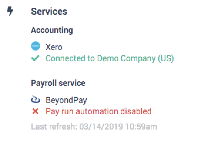 The services list on the left sidebar is used primarily by ArtsPoolers to maintain your organization's connections to two external systems: Xero (the accounting system) and BeyondPay (the payroll system).