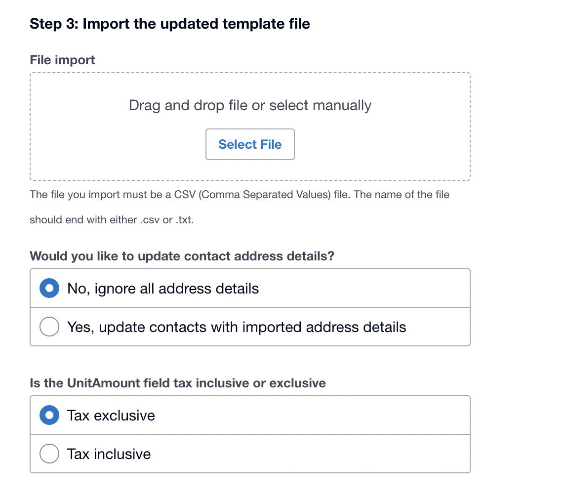 Upload the Xero Bill Import CSV into Xero by navigating again in Xero to: Bills to pay > Import > Step 3: Import the updated template file. You can drag & drop your CSV file, or select it manually by clicking "Select File"